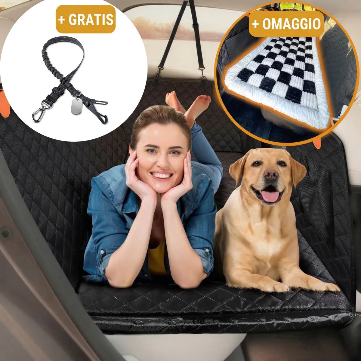 KIT VIAGGIO SICURO™ — COPRISEDILE AUTO 6-IN-1 A FONDO RIGIDO + CUCCIA E CINTURA DI SICUREZZA INCLUSE